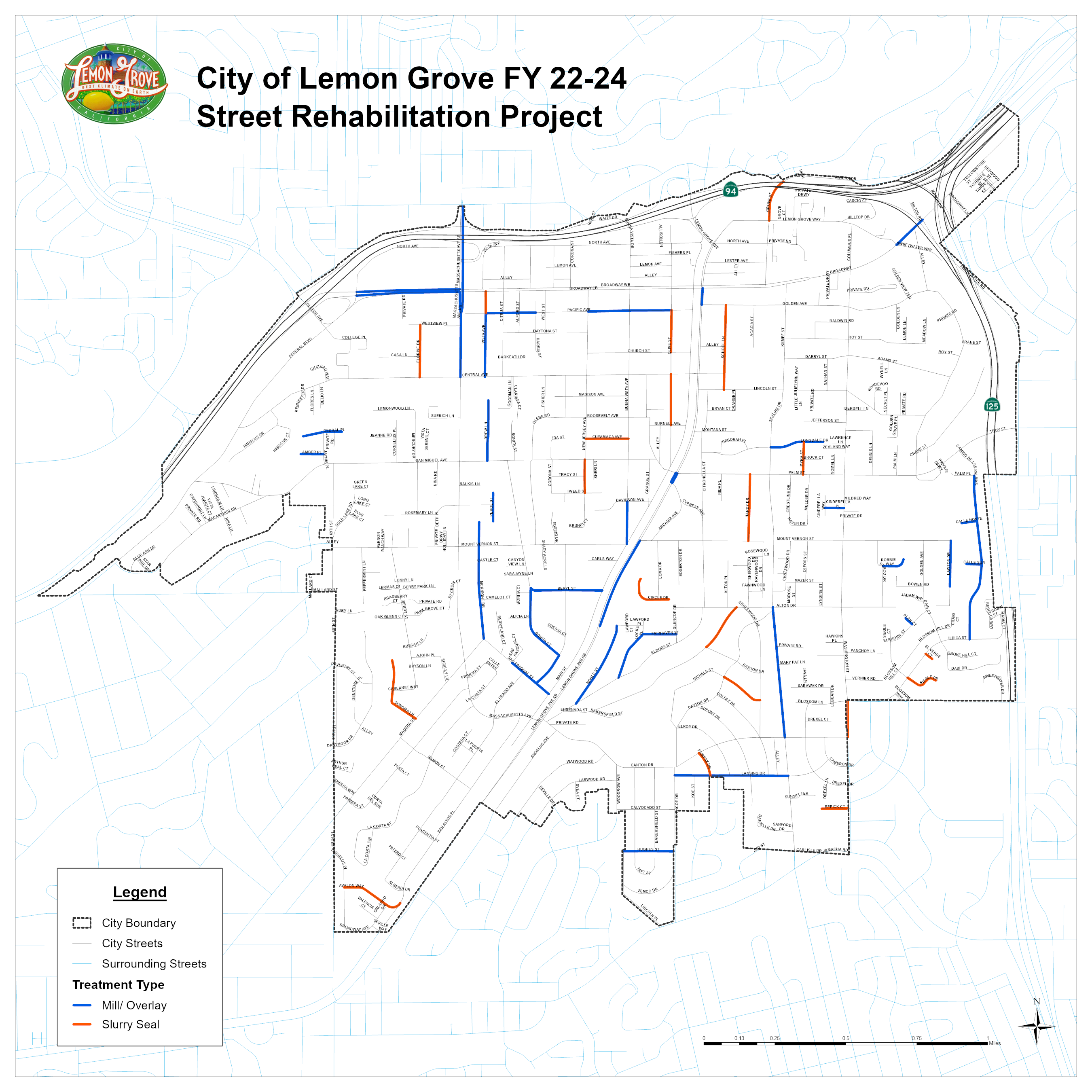 The FY 22-24 Street Rehabilitation Project was bid in the Fall of 2024 and awarded to Eagle Paving for construction on November 19, 2024. The Project is funded using funds from the American Rescue Plan Act (ARPA), Senate Bill 1, TransNet, and City General Funds.