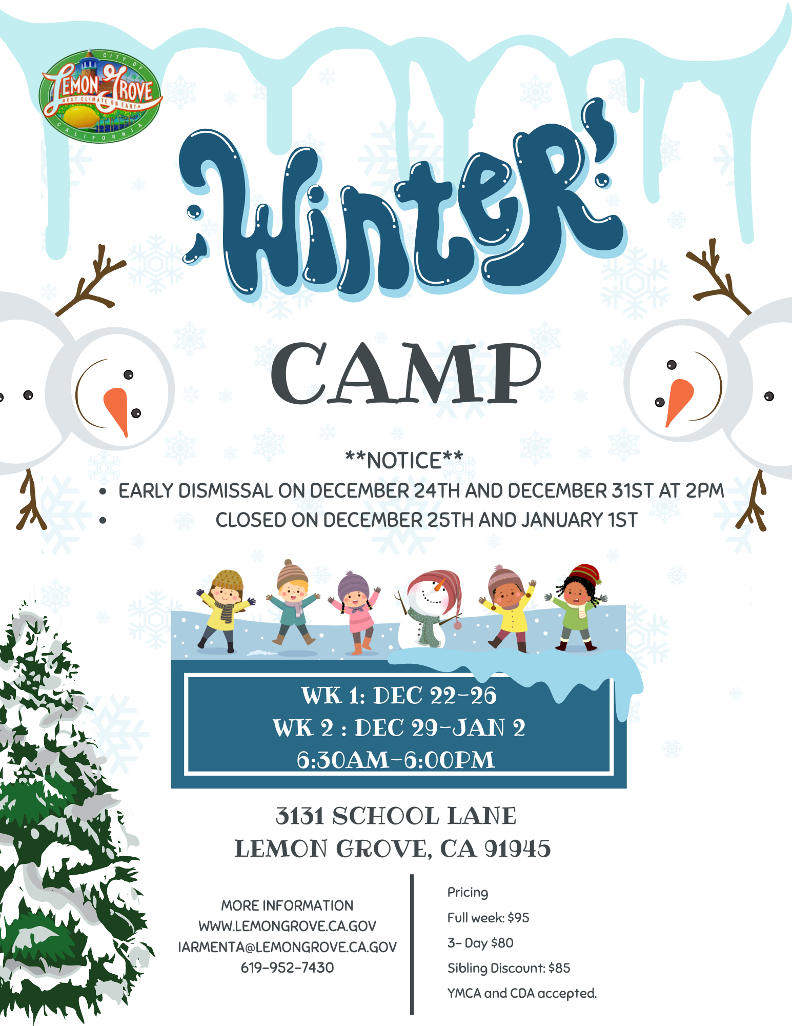- Refrain from bringing any valuables to camp, the City will not be responsible for lost or stolen items